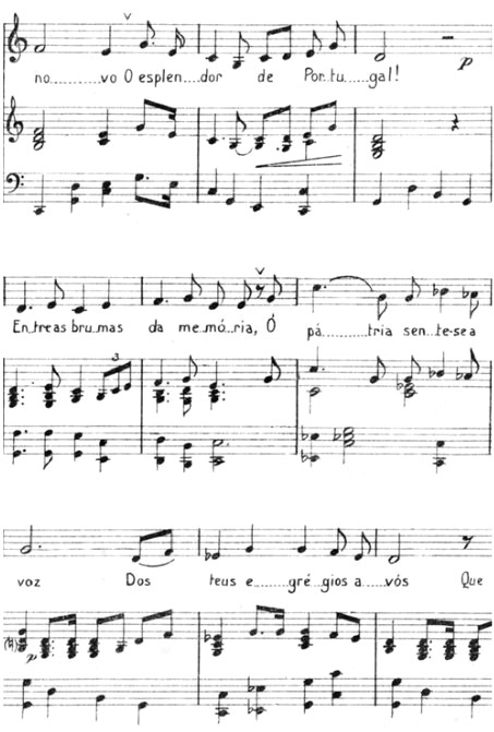 O actual hino nacional A Portuguesa, surgiu primeiro como uma marcha patriótica para piano, composta por Alfredo Keil, a que se juntaria depois a letra de Henriques Lopes de Mendonça. Foi provocado, por assim dizer, pela revolta contra o Ultimato inglês (11/01/1890), que, na sequência da Conferência de Berlim, nos obrigava a abandonar as possessões ultramarinas não ocupadas, indo contra as nossas pretensões do chamado Mapa-Cor-de-Rosa. A forçada aceitação do governo português levantou um coro de protestos nacionais contra o que se considerou, na época, de frouxidão da monarquia, mas que era, com efeito, a única possível, face ao poderio inglês.